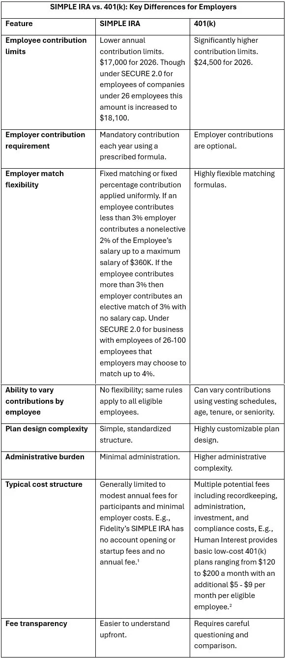 However, many small business owners may be focused on stabilizing cash flow, reinvesting in the business, or simply getting started with any formal retirement structure. If the owner cannot realistically imagine contributing above the SIMPLE IRA limits in the near term, and if low-cost predictability and ease of administration matter more than optional features, a SIMPLE IRA can be a rational and effective starting point. The rules are easier to understand, the employer obligations are clearly defined, and the cost structure is typically far more transparent.